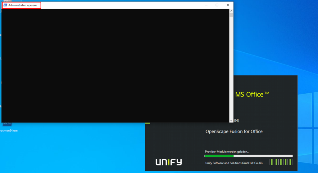 Once the three files have been placed in the C:\ directory on the system, the vulnerability is triggered the next time a user logs on to the system. In this case, an administrative logs on to the system. After the automatic start of OpenScape Fusion, ProcessMonitor confirmed that the file C:\Program.exe was searched for and found.