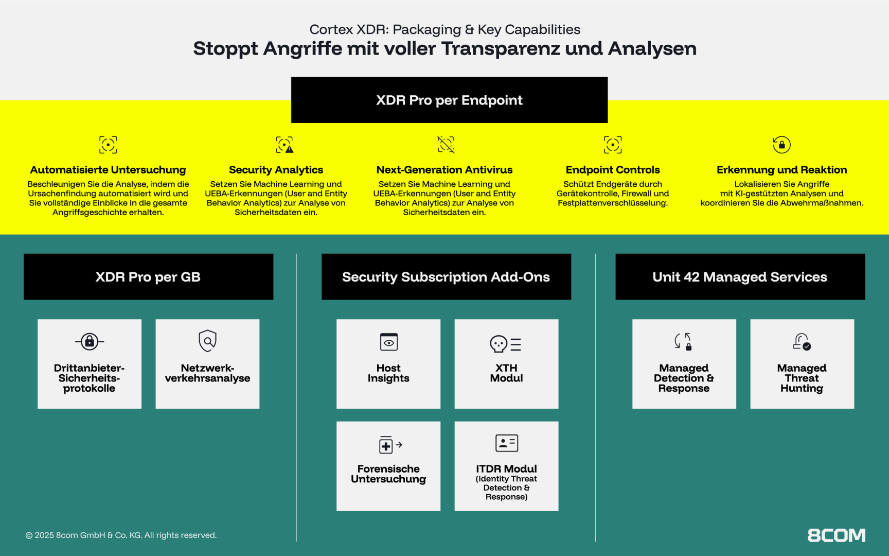 - XTH (Extended Threat Hunting): Zusätzliche Telemetrie und hunderte Detection Use Cases.